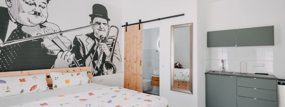 Neben dem kunstvoll eingerichteten Raum bietet das Künstlerzimmer eine Küchenzeile, die dir die Freiheit gibt, dich selbst zu verpflegen. Ob eine schnelle Mahlzeit oder ein gemütlicher Kaffee – du kannst in aller Ruhe deine kulinarischen Wünsche erfüllen.