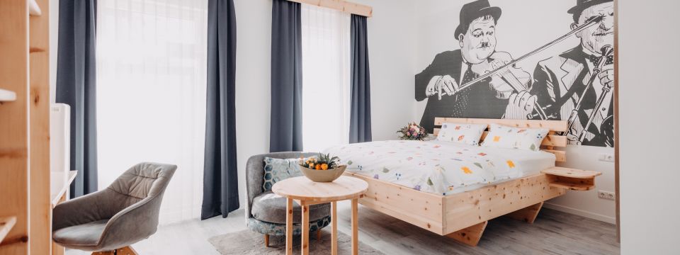 Das Zimmer ist mit hochwertigen Zirbenmöbeln ausgestattet, die nicht nur durch ihr ästhetisches Design, sondern auch durch ihre gesundheitlichen Vorteile bestechen. Das natürliche Zirbenholz sorgt für ein angenehmes Raumklima, fördert einen erholsamen Schlaf und eine beruhigende Atmosphäre – perfekt, um nach einem kreativen Tag abzuschalten und neue Ideen zu entwickeln.